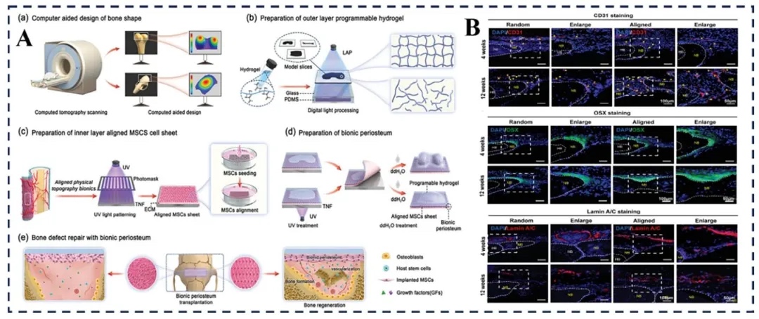 9. 血管化骨修复支架在仿生骨膜中的应用:展示了3D打印仿生血管化骨修复骨膜的设计与制备,以及免疫荧光图像显示的其在促进血管生成和骨生成方面的优势。这种仿生骨膜为骨缺损修复提供了新的思路和方法,有望改善骨修复效果。