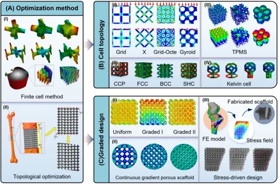 针对承重应用对植入体力学性能的苛刻要求,综述重点讨论了弹性模量匹配、应力分布优化、疲劳性能提升及骨固定与长期稳定性的研究进展,阐明了不同孔隙设计对力学行为的调控机制,并梳理了利用有限元分析与拓扑优化辅助设计的最新成果。