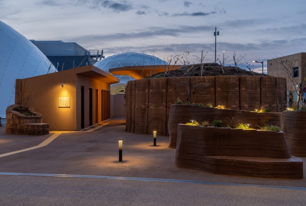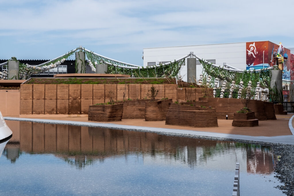 所有外墙面板在富山县的一家本地工厂由大幅面3D打印设备完成制造,随后运送至世博会施工现场,并通过预嵌木质连接件安装于木构框架上,实现快速且高精度的装配。该建筑系统直径为6.2米,高度为1.7米,部分构件现场打印成型,用于打造集“休憩空间”与“功能家具”于一体的花坛式长凳。最终实现的几何语言包括弧形围合体与岛屿状模块集群,为游客提供多样化的休息与互动体验。