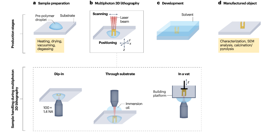 △MP3DL的制造步骤。a,样品准备。这通常涉及将聚合物前驱体的液滴或薄膜放置在基材上。根据材料的不同,最终准备可能需要后续加热或真空以去除溶剂。b,通过扫描激光束或使用定位台定位样品来制造3D物体。展示了三种可能的制造方法:浸入法;使用浸油的基材;以及在一个槽中。对于浸入法,光刻胶作为浸入介质,以保持折射率恒定。浸油的情况类似于标准显微镜的安排。在槽中,使用浸油,但树脂填充一个包含建筑平台的槽,该平台会移动以使新材料能够补充并延续制造过程。c,在稀释剂中显影。d,得到的自支撑3D结构。该结构可以直接使用或通过涂层或其他后处理方法进一步加工。MP3DL,多光子3D光刻;NA,数值孔径;SEM,扫描电子显微镜。