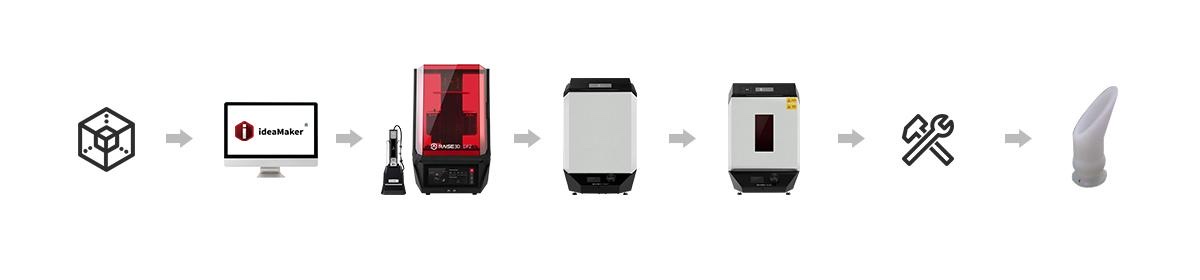 打印完成后,通过DF Wash清洗机和DF Cure固化机,模型得以快速清洗和固化。RFID技术在打印、清洗、固化的全流程中自动传输设置参数,无需人工干预,进一步提高了效率。