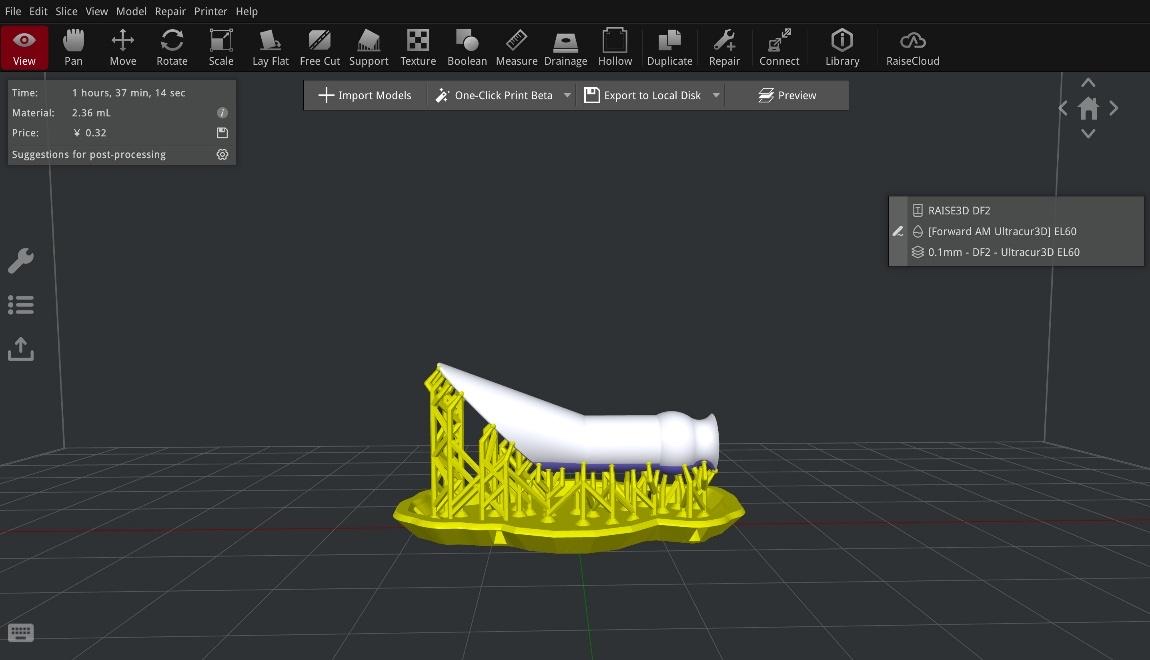 Raise3D团队在接到需求后,进行了详细评估。考虑到支撑模的佩戴舒适度,以及材料的医疗兼容性,团队经过多次试验,最终选定了柔性树脂材料——Forward AM Ultracur3D® EL 60,用于本次原型验证工作。