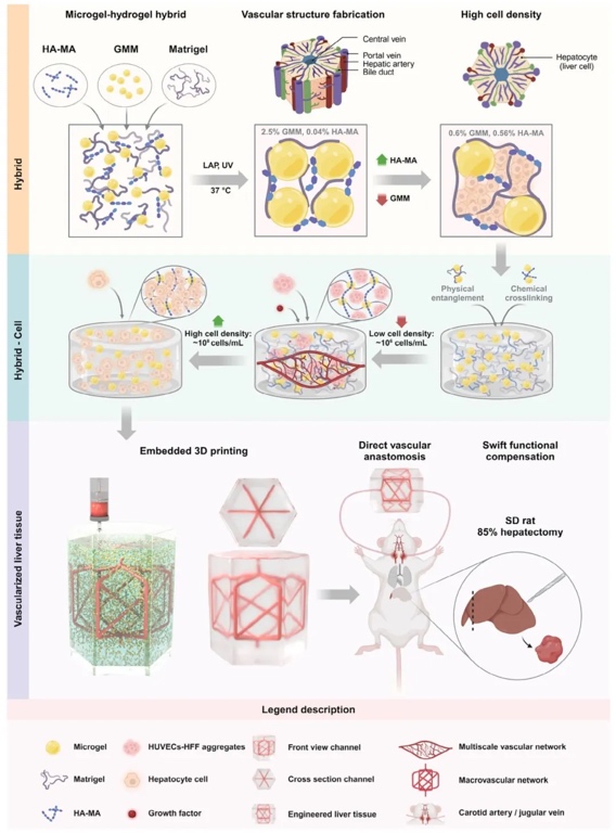 本研究开发了一种具有异质微环境的微凝胶-水凝胶杂化材料,它利用化学交联和物理缠结来调控基质刚度和孔隙结构。该杂化材料不仅能在体外支持多种细胞的形态发生和功能活动,还具备工程组织所需的机械性能,可实现直接血管吻合,促进体内快速功能补偿。通过将血管生成、血管发生与嵌入式3D打印相结合,在厚组织内构建了复杂的微血管网络和宏观血管通道。增强的机械性能使杂化材料能与宿主血管直接吻合,减少连接时间,降低厚组织坏死风险。通过调整微凝胶与生物大分子的比例,本研究在体外构建了高细胞密度的高度血管化肝组织模型,并成功植入急性肝衰竭的SD大鼠体内,实现了快速血液灌注和肝功能恢复,为构建具有独特理化性质的血管化组织提供了新方法。