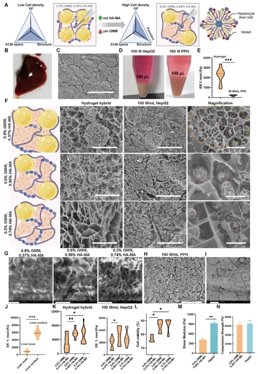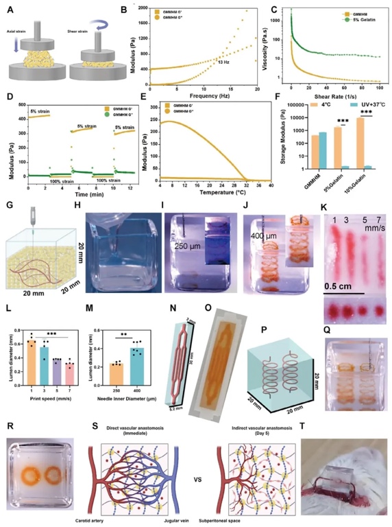 水凝胶杂化材料(GMMHM),通过优化微凝胶与生物大分子比例,形成的共价交联网络具备良好机械完整性,可进行直接血管吻合。该杂化材料支持多种功能,如嵌入式3D打印构建宏观血管网络、促进内皮细胞自组装形成微血管网络等。研究成果以“A
