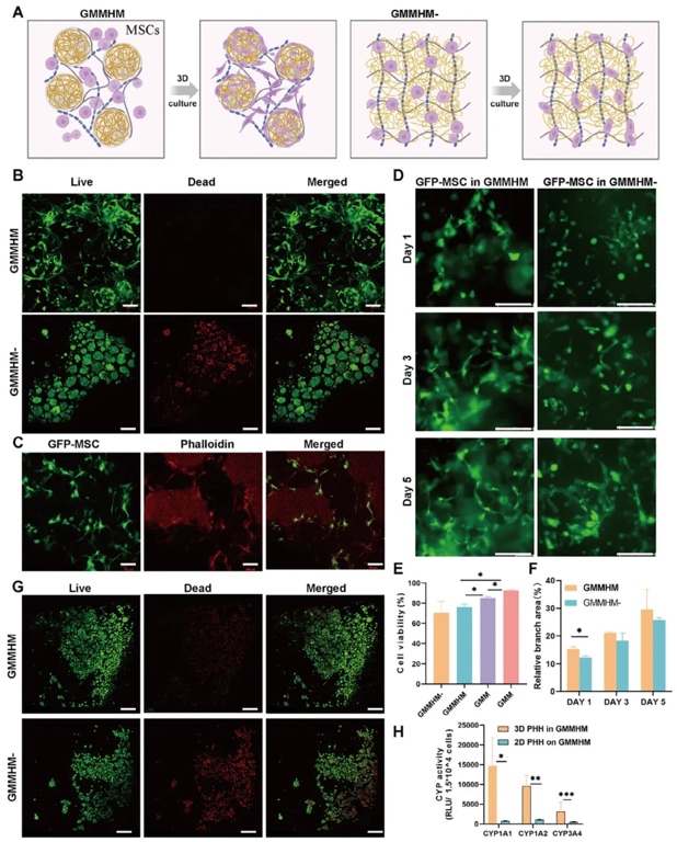 支持间充质干细胞和实质细胞活性,通过将不同细胞类型封装在GMMHM和GMMHM−中培养并检测细胞活性、代谢功能等研究方法,研究GMMHM对多种细胞活性和功能的支持作用。结果表明,GMMHM具有良好的生物相容性,可促进间充质干细胞(MSCs)、人脐静脉内皮细胞(HUVECs)等细胞的生长和扩展,支持原代人肝细胞(PHHs)和胚胎干细胞分化的心肌细胞的功能。