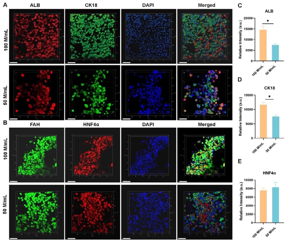 细胞密集型水凝胶杂化材料促进肝功能,通过免疫染色、定量聚合酶链反应(qPCR)检测肝相关蛋白和基因表达等研究方法,研究HCD的肝细胞在GMMHM中培养后的肝功能。结果表明,高细胞密度能增强肝组织功能相关蛋白和基因的表达,且添加黄原胶(XG)可改善GMMHM构建宏观血管的生物打印性能。