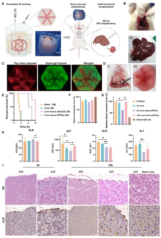 工程化血管化肝脏对SD大鼠的快速功能支持,借助建立大鼠肝衰竭模型、植入工程化肝组织并进行血液生化分析等研究方法,研究工程化血管化肝组织对急性肝衰竭SD大鼠的治疗效果。结果表明,植入含高细胞密度肝细胞的工程化肝组织可延长大鼠存活时间,改善肝功能指标,降低血清氨水平。