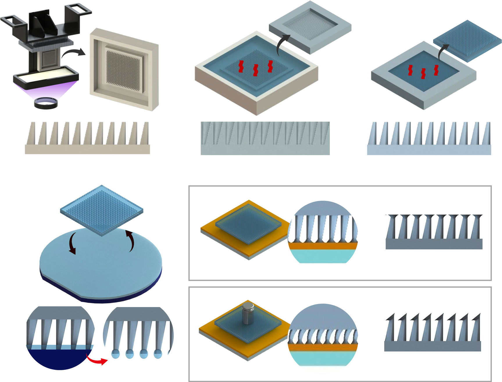 △使用各向异性结构制造软夹持器的后处理步骤。a 打印包含各向异性柱状结构的母模;b 第一次浇铸;c 第二次浇铸;d 收集预聚物液滴;e 固化的平坦垫表面;f 在施加压力下固化的倾斜垫表面。图片来自 Kim 等人,《微系统与纳米工程》,2025 年