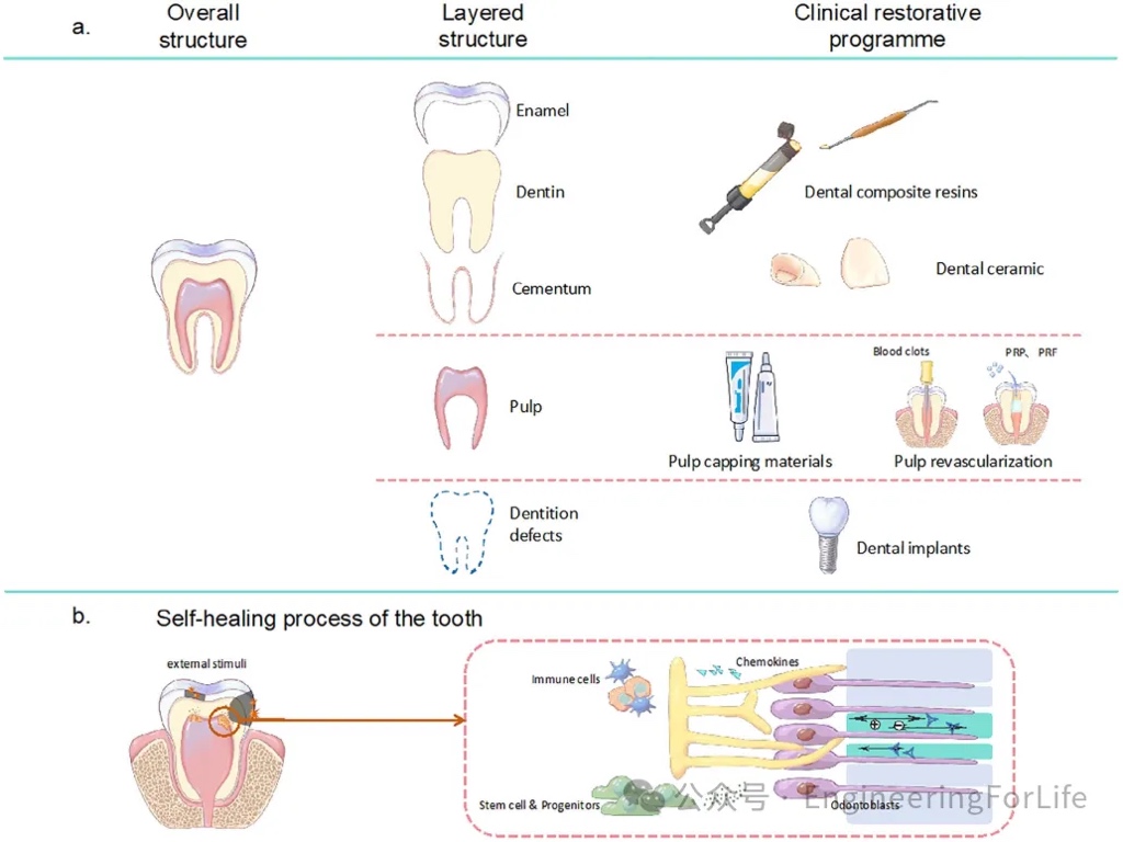 作者首先介绍了牙齿的生理结构和功能,包括牙齿的组成、自然组织修复机制以及牙科修复的临床材料(图2)。牙齿的结构包括牙釉质、牙本质、牙骨质和牙髓四个部分,介绍了它们的主要组成、功能及相互作用。作者进一步讨论了牙齿损伤后的修复过程,指出牙釉质无法再生,而牙本质可以通过牙髓-牙本质复合体的反应性修复来形成新的牙本质。牙科修复材料,如树脂修复材料、牙髓盖药剂、牙髓再血管化材料和牙种植体等,这些材料虽然在一定程度上恢复了牙齿的形态和功能,但无法完全复制天然牙齿的结构和功能。因此,组织工程学成为牙科组织再生的有前途的方法。