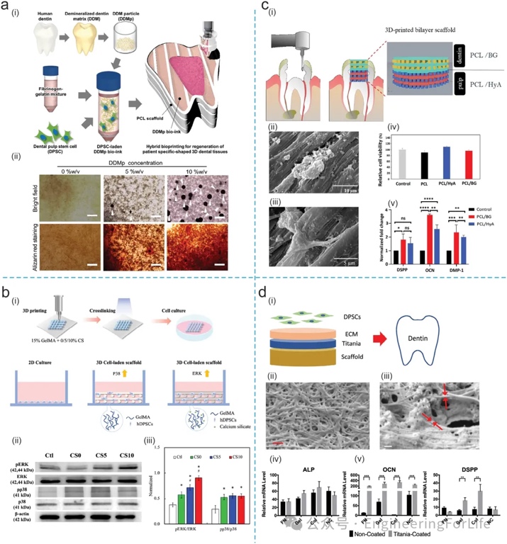 接着,作者总结了生物3D打印技术在牙科组织再生中的应用,包括牙科组织工程支架的生物特性、机械特性以及3D生物打印在牙科组织再生中的具体应用案例。理想的牙科组织工程支架需要具备生物相容性、生物活性和可控的生物可降解性,以促进硬组织或软组织的再生。此外,支架材料需要具备适当的机械性能和强度,以适应植入部位的组织。作者列举了牙科组织和牙齿根/牙齿再生的最新案例(图3-5)。