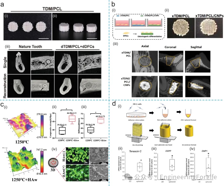 由创伤、细菌感染、颅面肿瘤和发育障碍引起的牙齿和牙齿缺陷的恢复和功能重建,是目前临床的主要挑战之一。牙科组织再生工程具有巨大的治疗潜力,可恢复天然牙齿的性能。生物3D打印技术提供了对支架孔径,形状和连通性的精确控制,从而创建了具有多个孔隙空间的复杂结构。此外,它们允许多种生物材料的分层分布促进各种组织的协同再生。