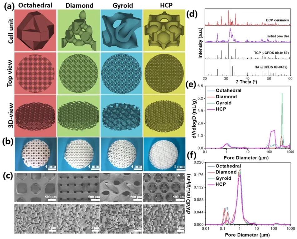 四川大学国家生物医学材料工程技术研究中心张兴栋院士、朱向东研究员、李向锋副研究员团队,通过优化孔隙架构来提升3D打印CaP陶瓷的骨诱导性。团队制备了具有六方密堆积(HCP)球形孔结构的CaP陶瓷,并构建了八面体、菱形和螺旋形结构作为对照。研究系统地探究了不同孔隙架构对陶瓷的结构、力学性能、渗透性以及细胞行为和体内骨诱导性的影响。相关工作以“3D