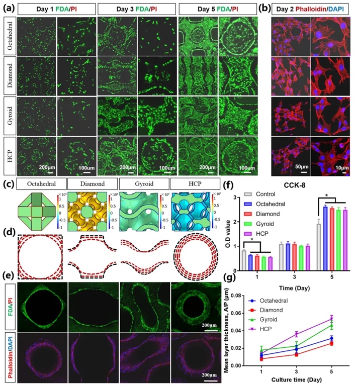 采用体外细胞培养实验,借助共聚焦激光扫描显微镜观察细胞生长和增殖,进行CCK-8实验检测细胞增殖,计算细胞层平均厚度,研究不同孔隙结构对MC3T3-E1细胞行为的影响。结果表明,细胞在各样本孔壁均能黏附和铺展,HCP结构组细胞生长均匀并形成圆环,虽然四组细胞增殖无显著差异,但HCP组细胞层平均厚度最大。