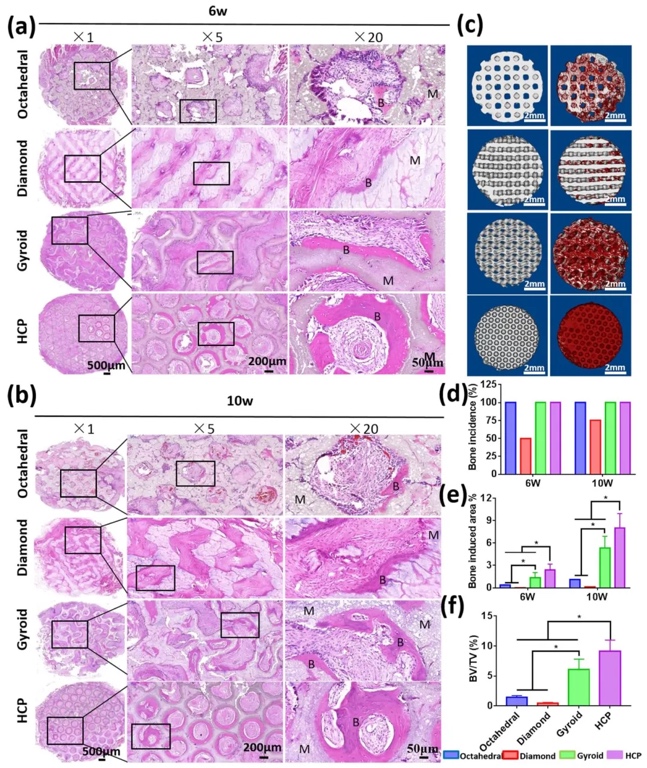 -CT扫描重建,研究不同孔隙结构CaP陶瓷的体内骨诱导性。结果表明,HCP结构组新骨形成最多,植入10周后新骨面积占比最高,骨体积分数(BV/TV)变化百分比最大,其骨诱导性在四组中最强。