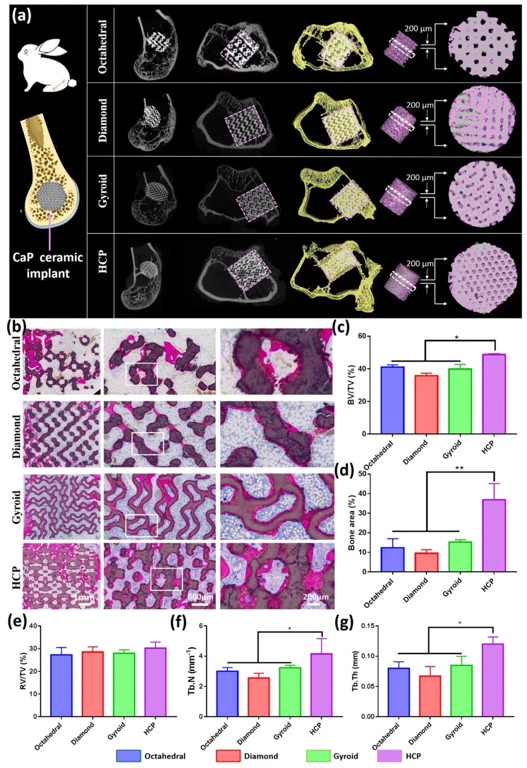 -CT重建和组织学染色,研究不同孔隙结构CaP陶瓷的体内骨再生能力。结果表明,HCP结构组与宿主骨整合良好,新骨形成量显著高于其他组,骨体积分数(BV/TV)、小梁数量(Tb.N)和小梁厚度(Tb.Th)等指标表现更优。