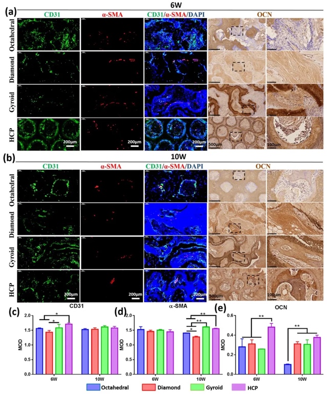 -SMA的表达,HCP组在术后6周时CD31表达最高,10周时α -SMA表达显著高于部分组;同时,HCP组的OCN阳性表达明显更高。