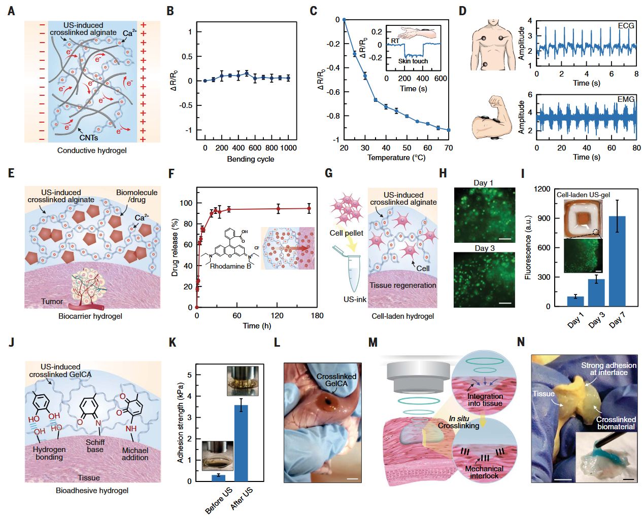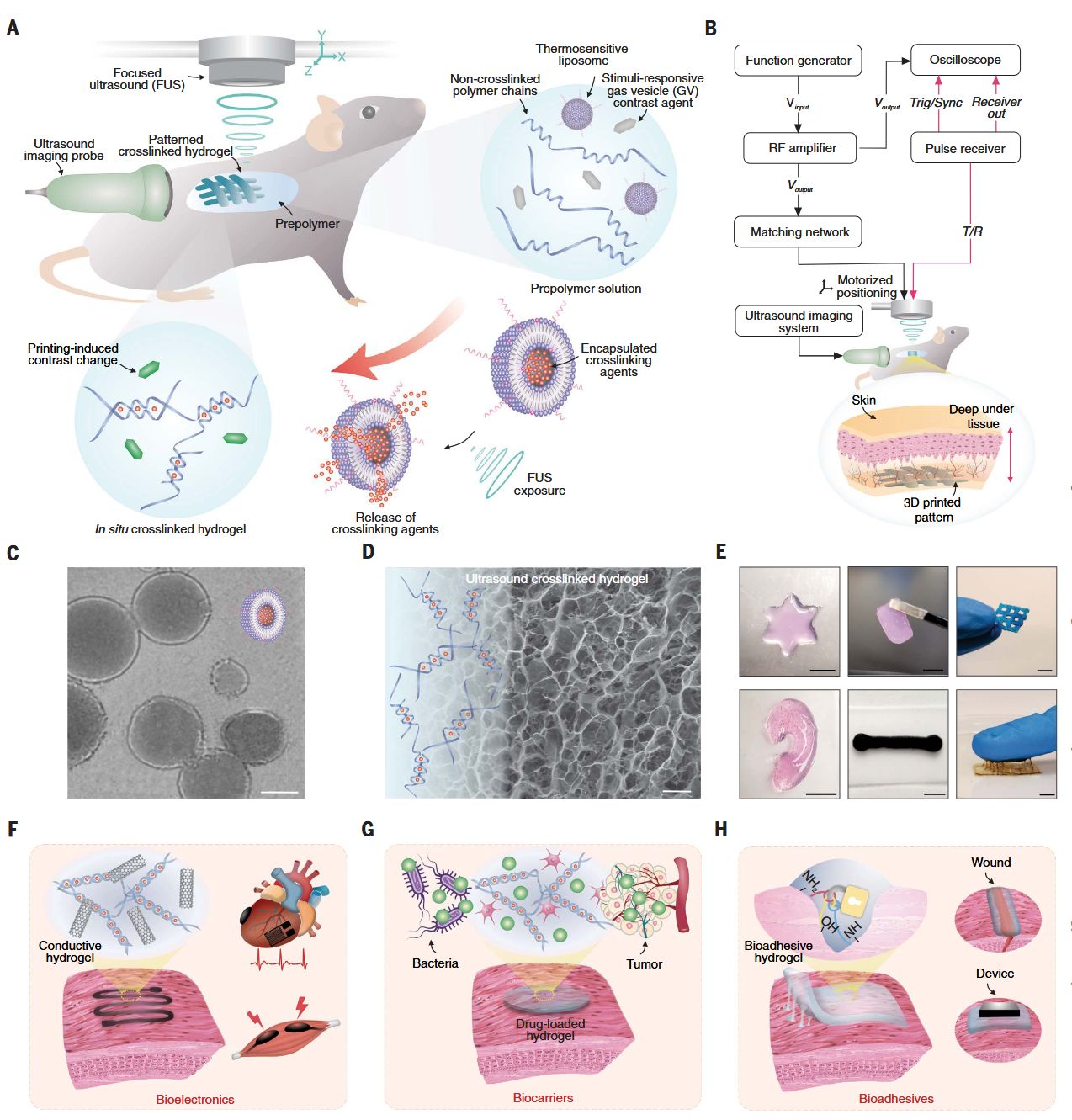 冷冻干燥的3D打印藻酸盐超声凝胶的扫描电子显微镜图像。比例尺,20微米。(E) 用声音在体内打印的功能性水凝胶结构。比例尺,5毫米。(F至H)