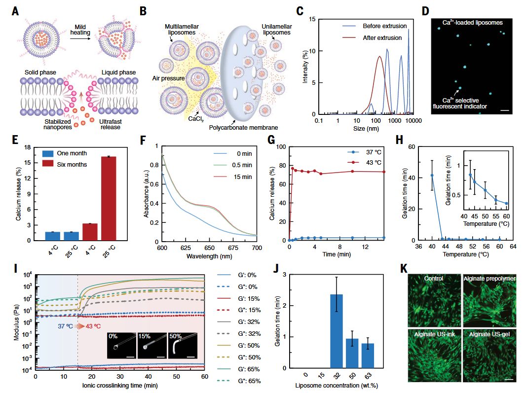 DISP平台示意图。DISP系统使用由非交联预聚合物、装载交联剂的热敏脂质体和气囊组成的超声墨水(US-ink)。该超声墨水被注入体内,以非侵入性方式在体内精确制造功能性生物结构。基于气囊的集成超声成像用于监测目标器官,检测预聚合物的存在,并确保准确定位和成功形成超声凝胶(US-gel)。(B)