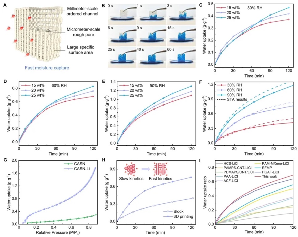 在全球范围内,室内除湿对于保障人体健康、提升舒适度,以及应对气候变化、推动可持续发展至关重要。本研究通过3D打印技术制备出具有仿生多孔结构的CASN-Li整体材料,用于快速湿度调节。直接墨水书写3D打印与化学交联相结合,使该整体材料具备毫米和微米尺度的多尺度孔隙,特别是3D打印形成的毫米级垂直定向通道,增加了与环境湿气的接触面积,有利于CASN-Li整体材料的吸湿和放湿。在60%相对湿度下,该3D打印整体材料的吸水速率比块状吸附剂高2.1倍,且20分钟内可释放80%以上的吸水量。装置级的演示实验表明,一块CASN-Li整体材料能在25分钟内,将体积为自身6750倍空间内的相对湿度从90%降至60%以下。这显示出3D打印结合基于吸附的大气集水技术,在高效湿度管理方面具有广阔的应用前景。