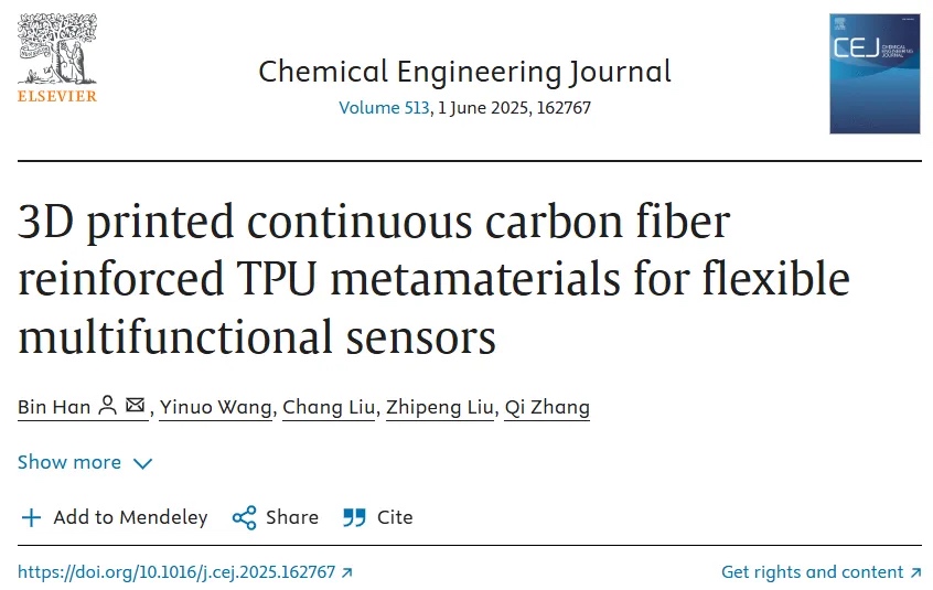 近期,西安交通大学韩宾、张琦教授团队提出一种创新方法:基于连续碳纤维(CCF)和热塑性聚氨酯(TPU),通过熔融沉积建模3D打印技术结合星形超材料设计,成功制备高性能柔性多功能传感器。相关成果以“3D