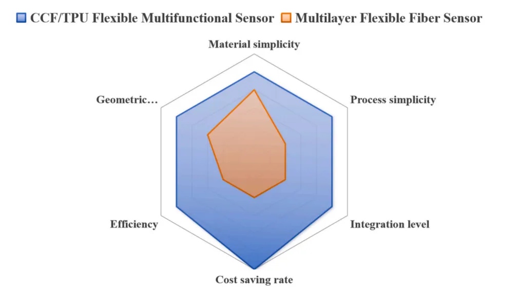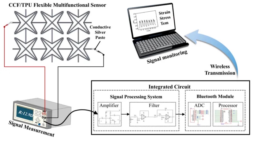 (1)通过超材料结构设计,赋予CCF/TPU传感器对应变、应力及温度的协同响应能力,首次实现单一材料多物理场同步检测,为复杂环境监测提供关键数据。