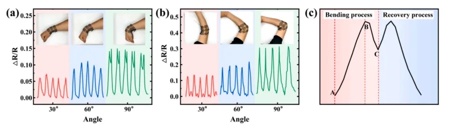 (2)基于手形超材料的柔性传感器成功应用于人体肘部运动监测,验证其在运动追踪场景的实用性,拓展了可穿戴设备的传感维度。