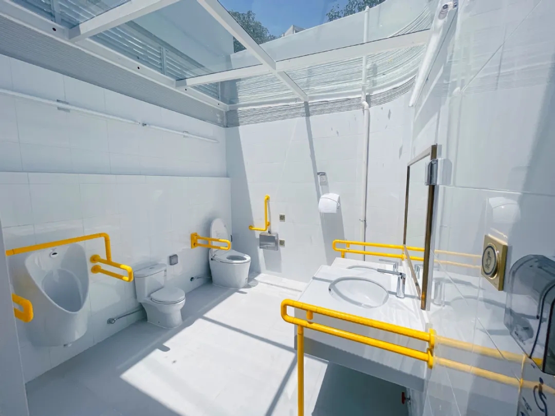 在功能布局上,驿站充分践行人性化与融合化理念,突破单一公厕功能,将公共厕所与综合服务设施有机结合,构建起“城市驿站+智慧公厕”的创新复合空间。该空间涵盖卫生间、休息室等基础功能模块,并特别规划直饮水设备和手机充电站,后期将免费向户外工作者及市民开放,提供休憩、饮水等便民服务,充分展现城市公共服务的温度。