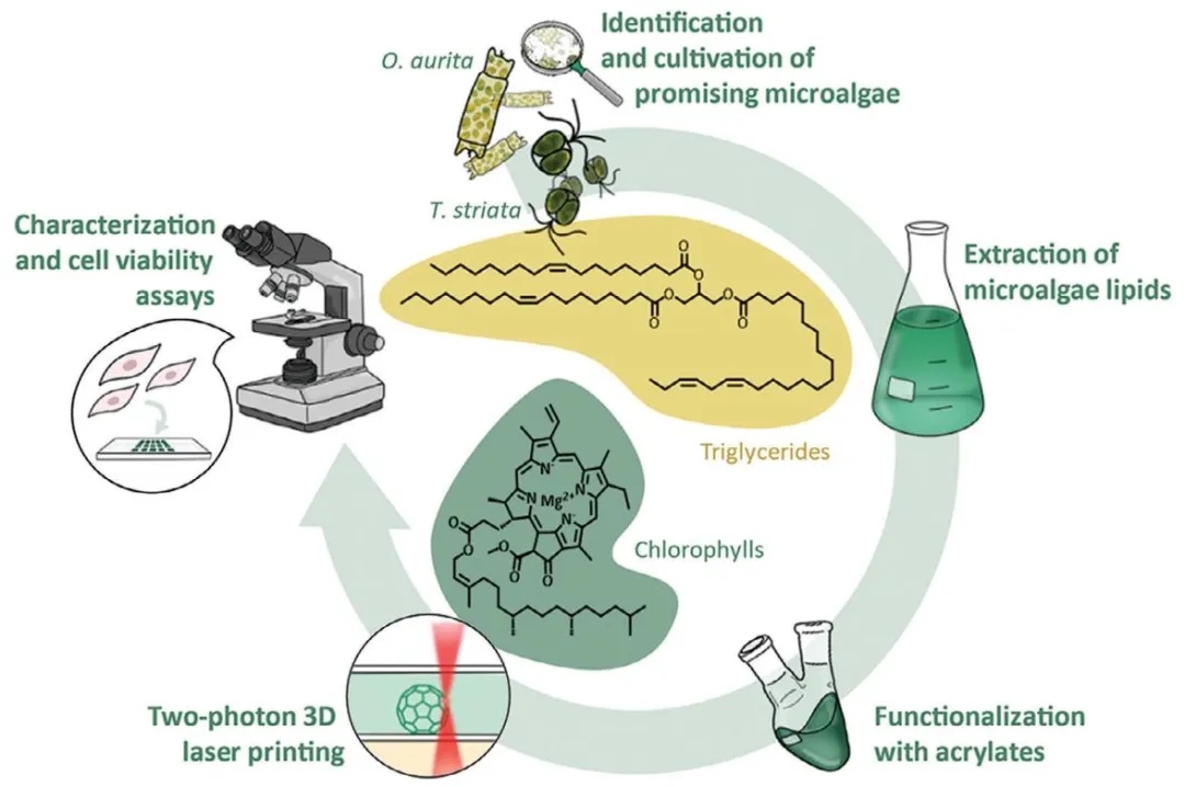 本研究证实了微藻作为独特且可持续的“生物工厂”,在开发适用于双光子3D激光打印的生物相容性材料方面的可行性。研究选取的O. aurita和T.
