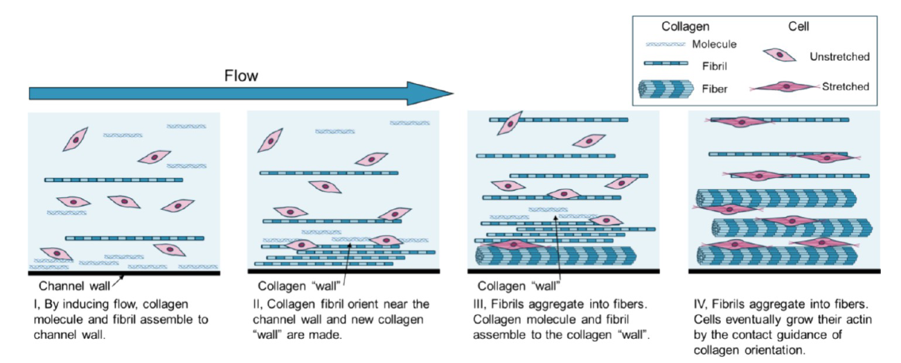 △流动诱导胶原蛋白和细胞定向的机制示意图
