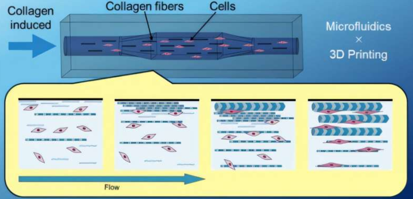△定向胶原模型创建的示意图。实验流程概述,展示了由流动诱导的胶原原纤维、纤维和细胞定向排列