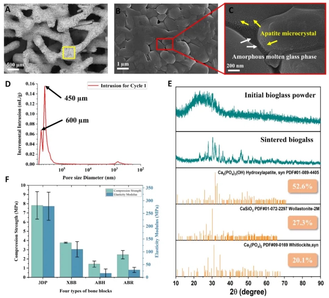 3DP的设计与制备及微观结构表征,利用3-Matic软件设计包含哈弗斯管和小梁多孔结构的3DP模型,通过DLP设备打印并烧结成型,采用扫描电子显微镜(SEM)、压汞仪(MIP)和X射线衍射仪(XRD)等方法对其微观结构和晶体相进行研究。结果显示,3DP精准呈现设计结构,表面粗糙多孔,总孔隙率51.5%,有双峰孔径分布,大孔利于骨长入,纳米孔增强细胞黏附,烧结后含有氟磷灰石、β-白磷钙石和β-硅灰石晶体。