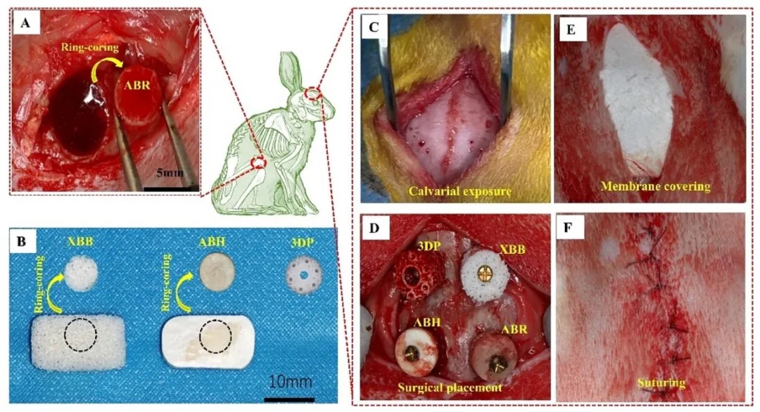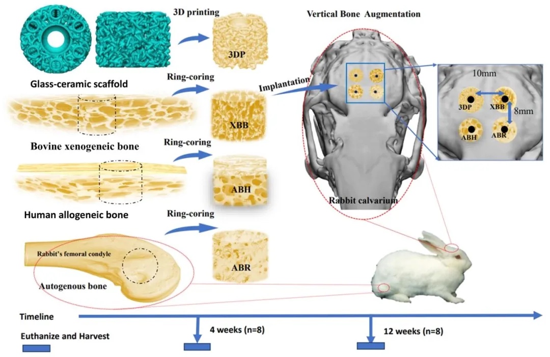 来自北京航空航天大学生物与医学工程学院樊瑜波教授团队利用数字光处理(DLP)增材制造技术,创新性地设计并制备出具有哈弗斯管和小梁多孔结构的3D打印玻璃陶瓷支架(3DP)。团队对3DP的形貌、微观结构、元素组成和机械特性进行研究,并与牛异种骨块(XBB)、人同种异体骨块(ABH)和兔自体骨块(ABR)对比,还通过兔颅骨模型评估它们的垂直成骨能力。相关工作以“Enhanced