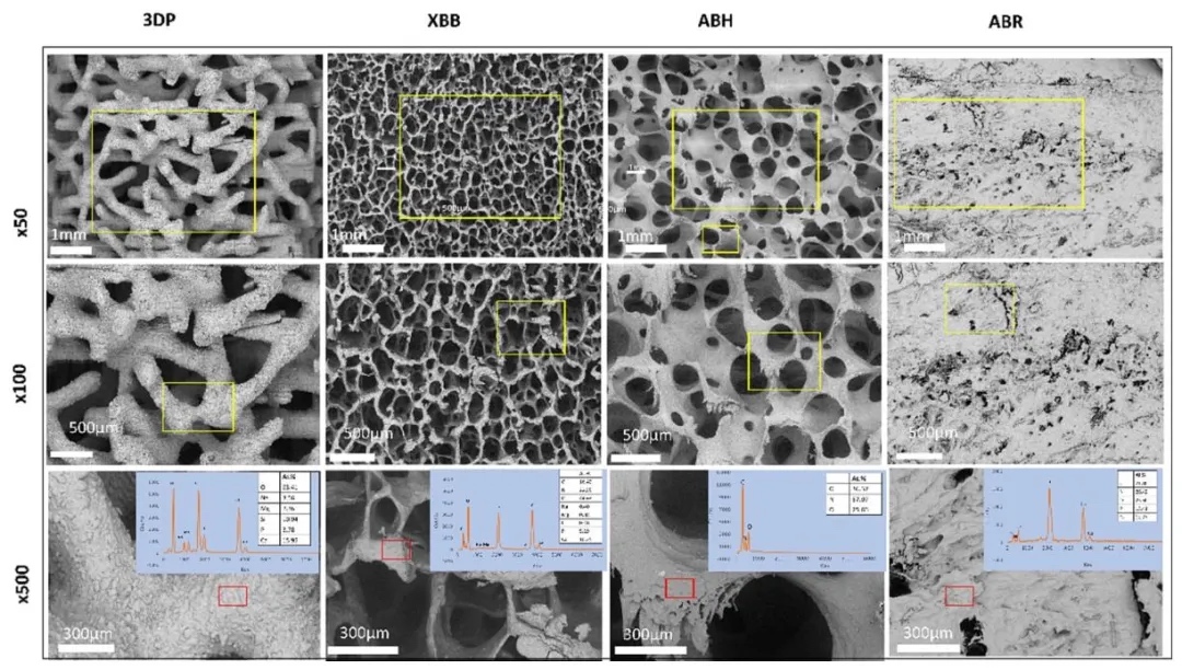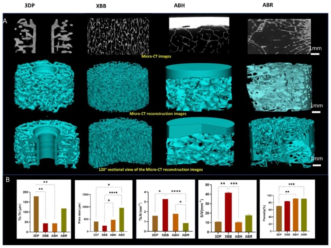 四种骨块移植物的综合特性分析,运用SEM、能谱仪(EDS)、Micro-CT和万能材料试验机,对3DP、牛异种骨块(XBB)、人同种异体骨块(ABH)和兔自体骨块(ABR)的表面形貌、元素组成、内部微观结构、压缩强度和弹性模量进行观察与测试。结果表明,各骨块表面形貌和元素组成差异明显,3DP的小梁厚度较大,ABR的孔径最大;3DP的压缩强度和弹性模量相对较高,各骨块在微观结构和力学性能方面差异显著。