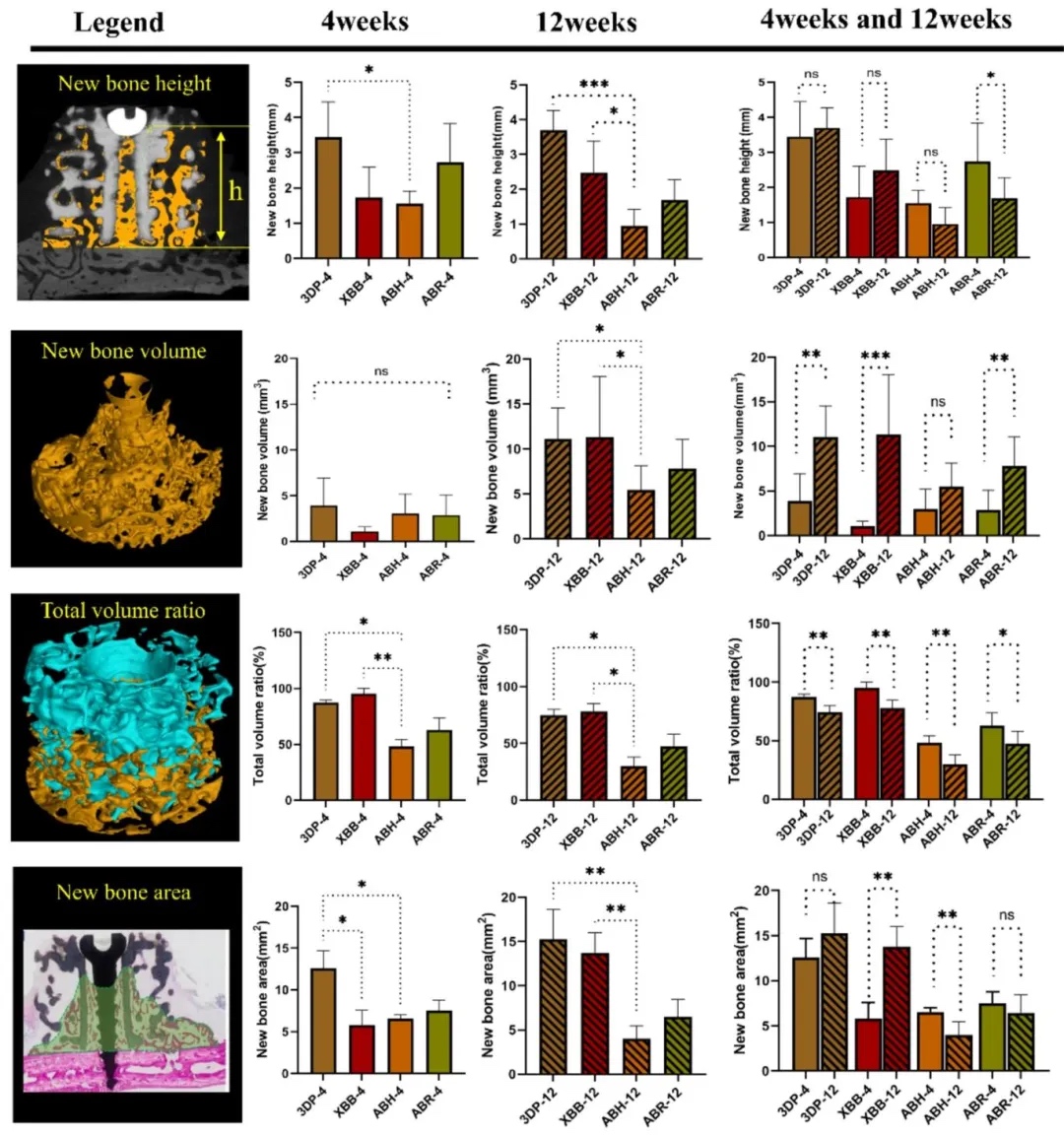 ,3DP早期垂直成骨更快;组织学分析显示,所有骨块均与宿主骨整合,但3DP新骨呈定向生长,且在4周时新骨面积显著高于XBB和ABH。