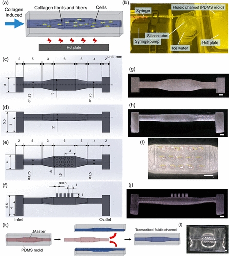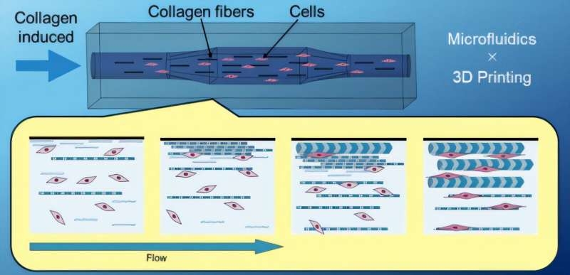 Maruo领导的团队,创新性地提出了一种不依赖磁性颗粒或有机溶剂的方案,仅利用I型胶原蛋白溶液和细胞混合物,结合定制化3D打印母模和微尺度流体通道,通过引导流体流动方向来控制胶原束的排列,实现细胞与纤维在水平与垂直方向的精准定向。
