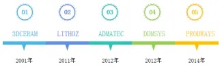 CERAM(尽管3DCERAM公司2001年成立,然而他们直到2015年才推出首款工业级陶瓷3D打印机[5])、LITHOZ、ADMATEC、Prodways等,这些企业成立的时间轴如下图所示。