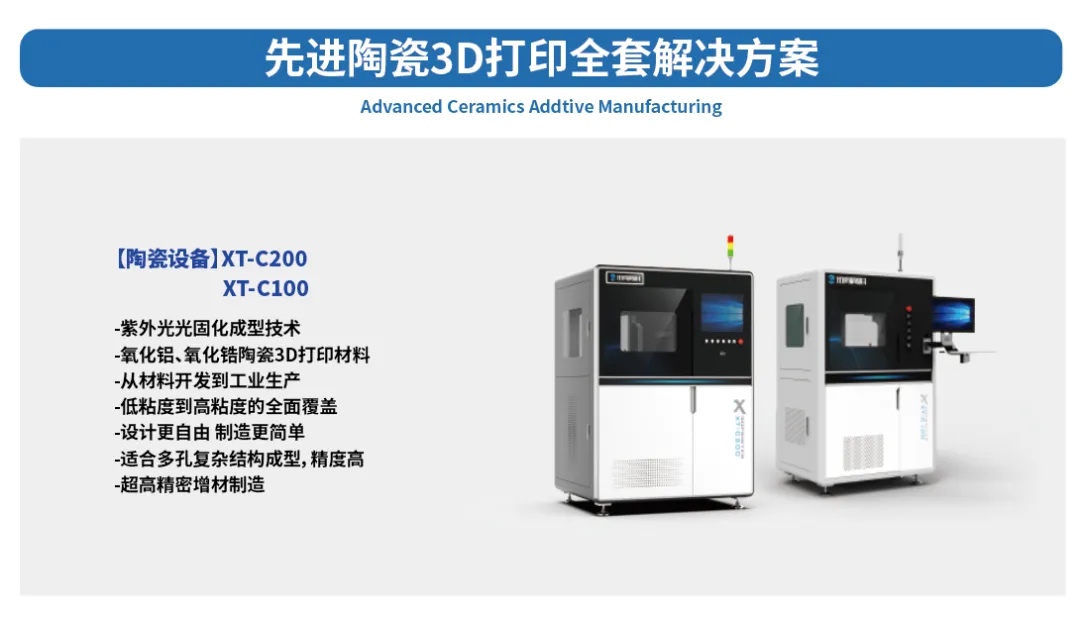 )光固化陶瓷团队是国内较早开始进行工业级陶瓷光固化浆料配方、工艺应用开发的专业团队之一,从2016年开始至今已有该领域将近十年的技术累计,公司的优势在于将近十年的陶瓷光固化材料配方与工艺的研发,并且深耕于高纯度氧化铝、高精度高强度氧化锆等少数几种热门应用陶瓷材料的开发,应用于航空航天、半导体、精密电子等行业。公司在2023年面向市场推出了XT-C100、XT-C200机型,这些陶瓷打印机的推出是公司光固化陶瓷浆料及工艺技术累积下的装备定向开发。