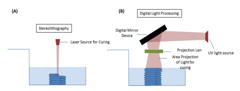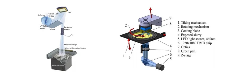 Light Procession)进行面曝光的光固化陶瓷3D打印机(以下简称此方式为DLP),两者的示意图如下[7]: