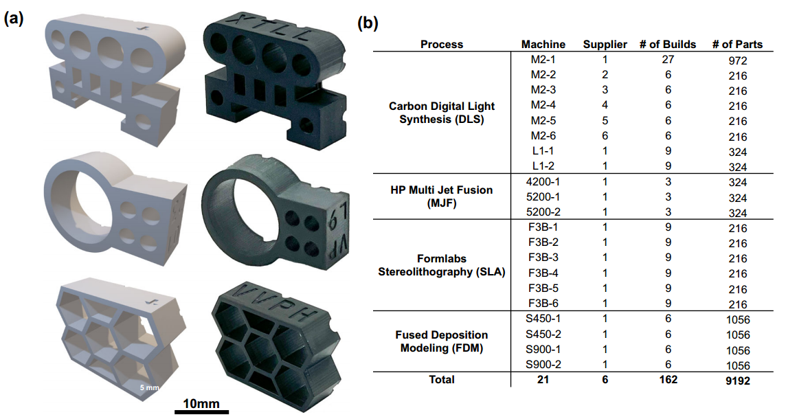 该研究的核心在于开发一种能够从零件照片中识别其制造来源的深度学习模型。研究人员使用了21台不同的打印机,生产了9192个零件,涵盖了三种独特的设计和四种AM工艺:数字光合成(Digital