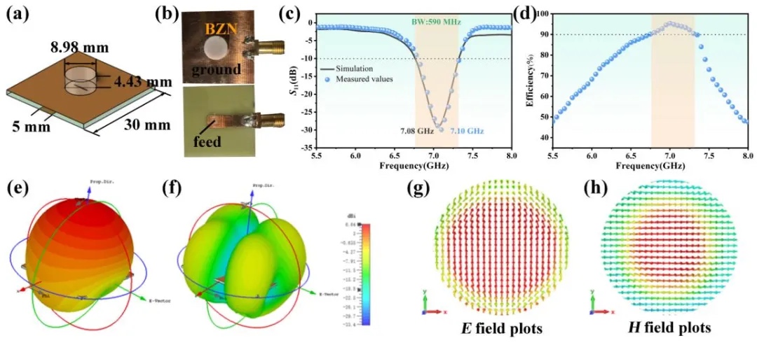 在此基础上,作者设计并制备了圆柱形BZN介质谐振天线(图3),由于介质谐振块具有显著的共振和辐射效应,实现了超带宽范围的高辐射效率:实测通带带宽为590MHz(6.76GHz至7.35GHz),辐射效率超过90%,实测中心频率为7.1GHz。以上研究验证了通过光固化技术制备的微波介质陶瓷在高频通讯技术领域具有潜在的应用价值。