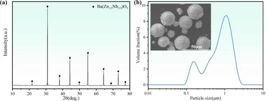 首先,作者通过传统固相合成法制备出平均粒径为900纳米的BZN微波陶瓷粉末。并通过喷雾干燥工艺将亚微米粒径的陶瓷粉末预团聚成直径10微米至40微米左右的球形颗粒,以此来降低陶瓷粉末团聚现象,并可以提高陶瓷浆料的固相含量(图1)。在此基础上,通过调节分散剂含量,制备出固相含量为82wt%的BZN陶瓷浆料。