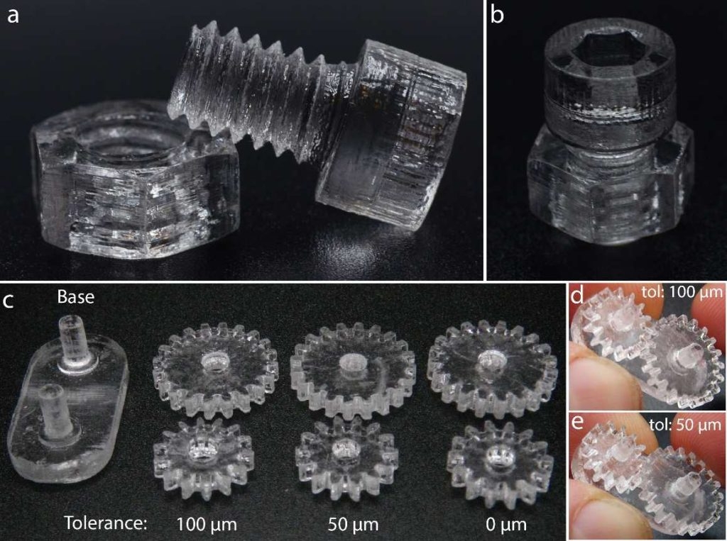 AE-VAM则通过采用简单的光学反馈系统解决了这一问题,新技术可以在固化过程中测量散射的红光。当测量到的信号达到预定的校准阈值时,紫外线照射会自动停止。研究人员指出,这使得这项工艺“不受几何形状的影响”,并且特别适合进行多部件组装的打印,如齿轮系统和螺纹部件。AE-VAM打印的机械部件:一个功能齐全的¼-20螺钉和螺母,以及一个公差为50μm的齿轮组件。这些部件也可以与标准金属硬件配合使用