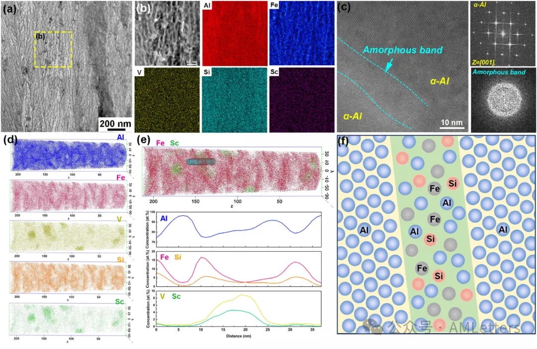 钪元素的加入进一步促使 Al3Sc 界面相生成,有效阻止高温下纳米颗粒的粗化,使材料兼具超高强度和热稳定性。