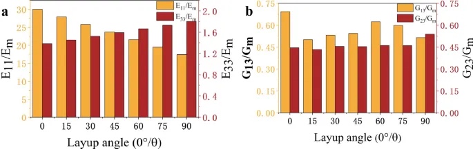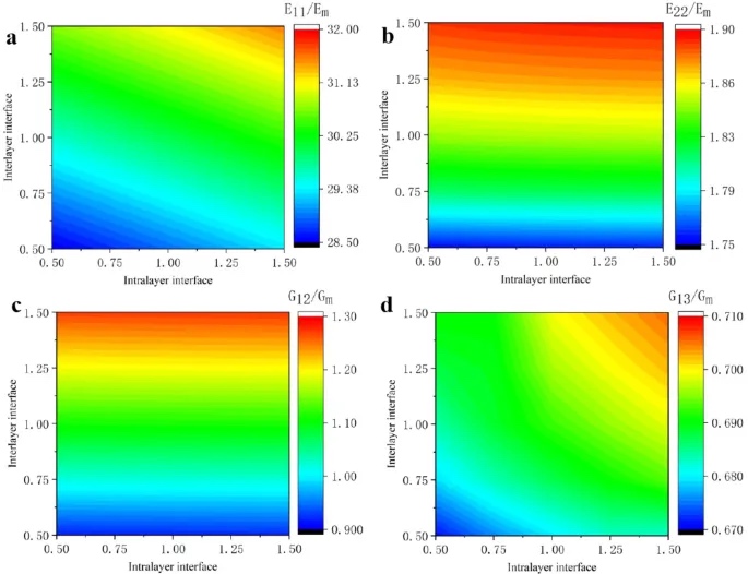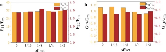 mm时,横向拉伸模量下降15%-20%,主要归因于孔隙率上升(实验与模型误差<6%)及层间聚合物扩散结合弱化。界面性能对剪切模量调控显著,界面粘结强度提升1.5倍可使纵向剪切模量增加25%。偏移铺层技术(如1/8丝宽偏移)通过优化孔隙填充和界面接触,使横向拉伸模量提升12%,而离轴铺层中45°铺层因纤维交错增强应力传递,剪切模量较0°铺层提高18%。