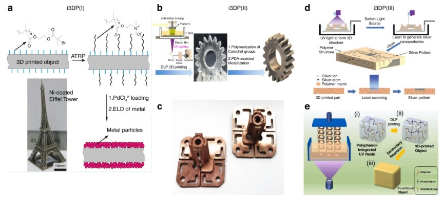 △通过将活性引发剂集成到打印材料中实现的3D打印电子产品。图片来自Springer Nature。