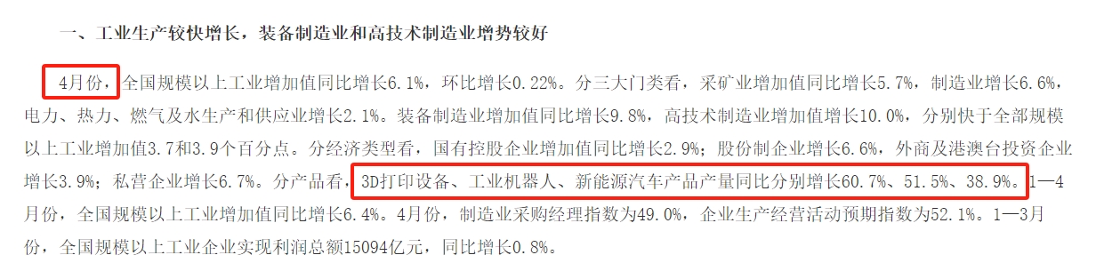 2025年5月24日,最近国家统计局发布了4月份的经济数据,其中提到:“分产品看,3D打印设备、工业机器人、新能源汽车产品产量同比分别增长60.7%、51.5%、38.9%。”这一数据不仅反映了我国高端制造业的蓬勃发展,也凸显了3D打印产业在新质生产力推动下的强劲上升势头。