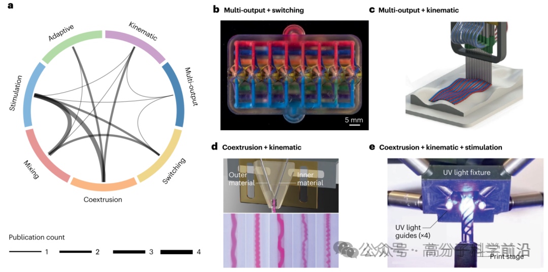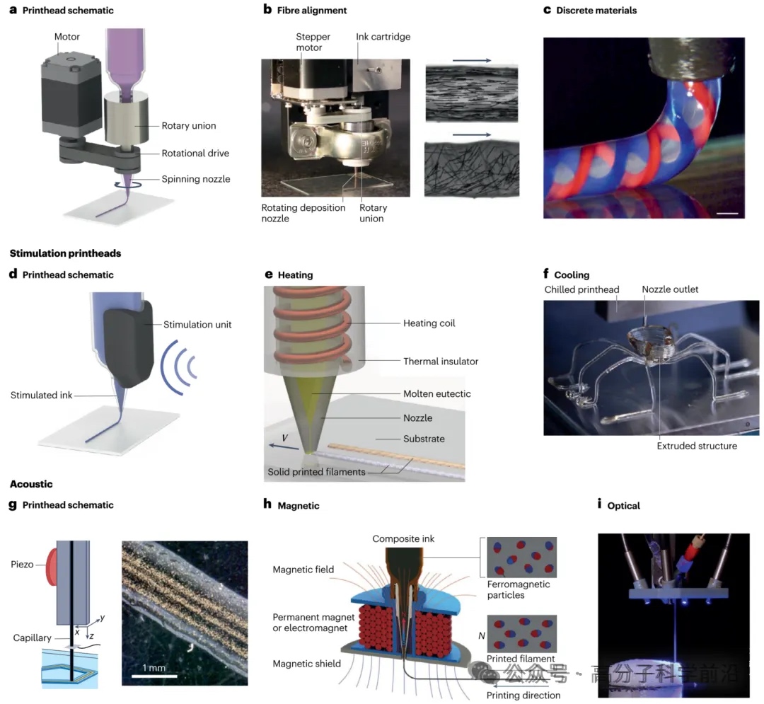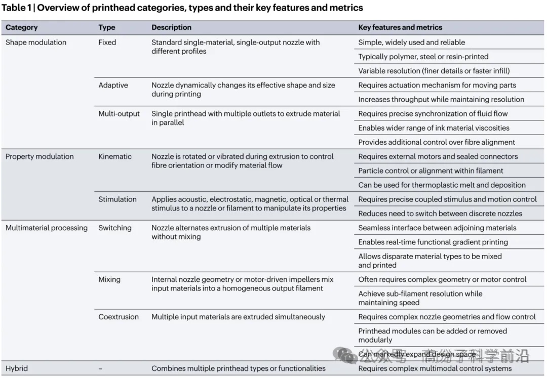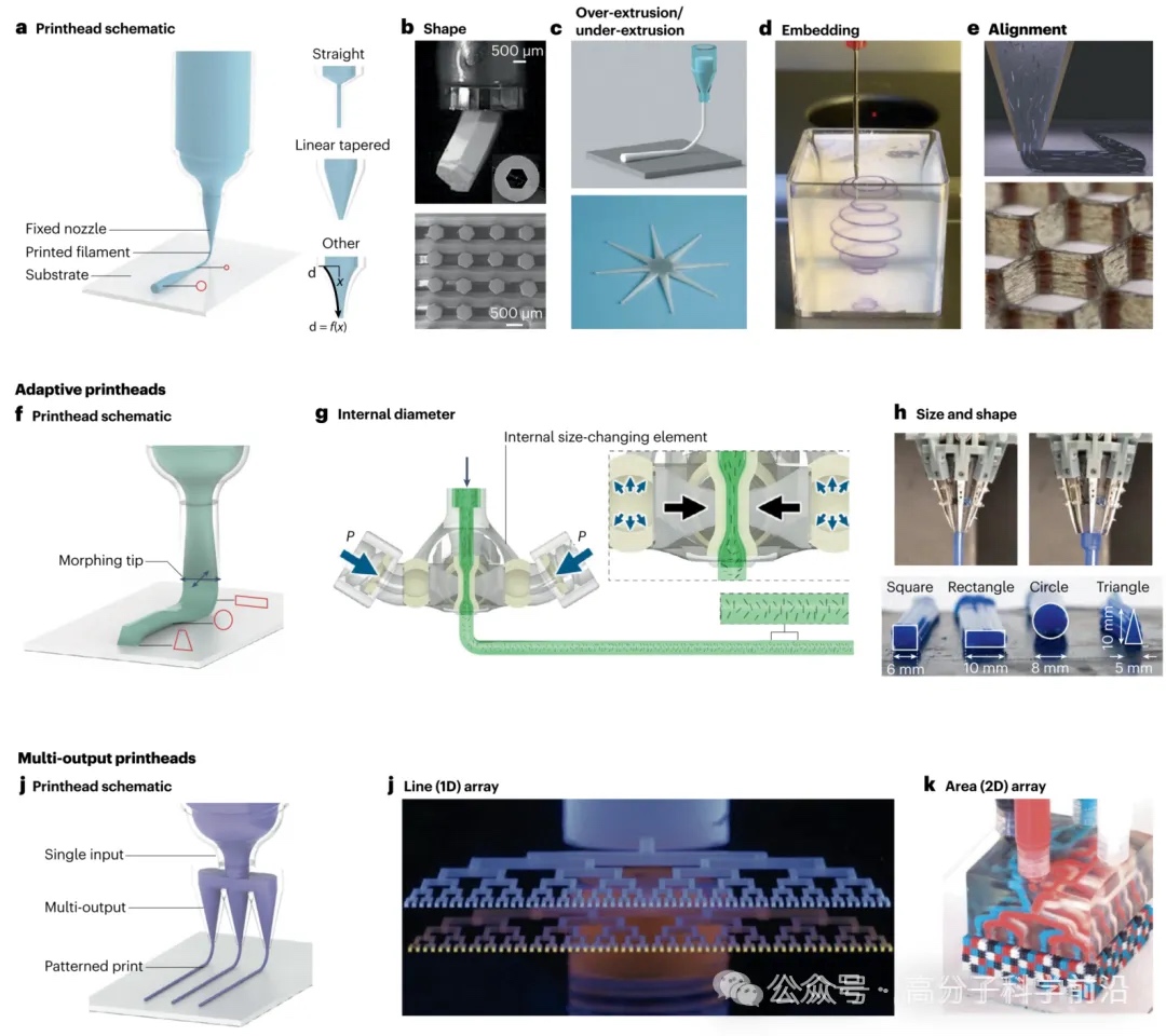 1.形状调制喷头:包括固定、自适应和多输出喷头,能够动态调整喷嘴尺寸和形状,优化打印分辨率和速度。例如,自适应喷头通过改变出口直径,实现了从微米级到厘米级结构的无缝打印。