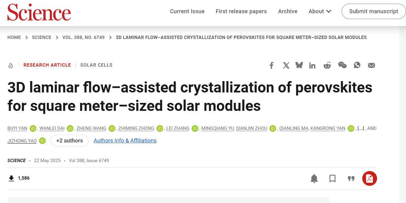 2025年5月,来自杭州微导纳米科技有限公司、浙江科技学院土木工程与建筑学院、浙江大学光电科学与工程学院等机构的科研人员在Science上发表了一项突破性研究,题目为3D laminar flow–assisted crystallization of perovskitesfor square meter–sized solar modules,展示了利用3D打印技术优化钙钛矿太阳能电池(PSCs)大规模制造工艺的创新方法。研究人员通过设计并3D打印一种新型的层流空气干燥器(LAD),成功解决了大面积钙钛矿薄膜均匀结晶的难题,推动了高效、稳定的平方米级钙钛矿太阳能组件的商业化生产。