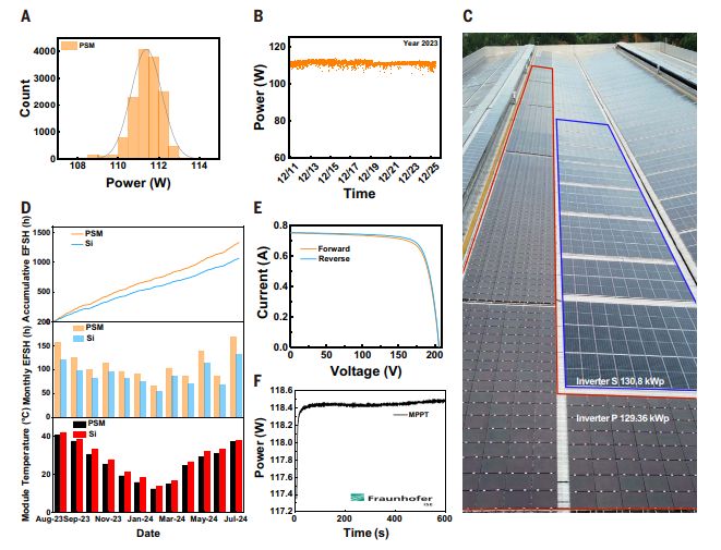 为了评估LAD技术生产的钙钛矿太阳能组件在实际应用中的表现,研究团队在中国衢州的一个屋顶分布式光伏系统中安装了总计523.8千瓦峰值功率的钙钛矿组件,并与同一地点的硅基太阳能组件(总计4893千瓦峰值功率)进行了为期一年的并行发电性能对比。结果显示,在实际运行条件下,单位装机容量的钙钛矿太阳能组件年发电量比硅基太阳能组件高出29%。经过一年运行,该批钙钛矿组件的功率衰减率低于2%,初步估算的T90寿命(功率衰减至初始值90%的时间)可达9年。