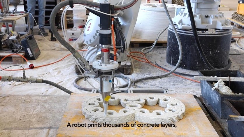 Tor Alva 大楼于 2025 年 5 月竣工,是世界上首个完全通过3D 打印技术打造承重柱(包括内置钢筋)的多层建筑。3D混凝土打印方法采用两台协作机器人:一个机械臂将混凝土逐层挤压成复杂的自由形状,另一个机械臂则在各层之间放置钢筋。使用一种特殊设计的细粒混凝土,由于添加了定制添加剂,混凝土能够快速硬化,因此无需传统模板即可生产结构部件。这项打印技术由苏黎世联邦理工学院与行业合作伙伴合作开发。